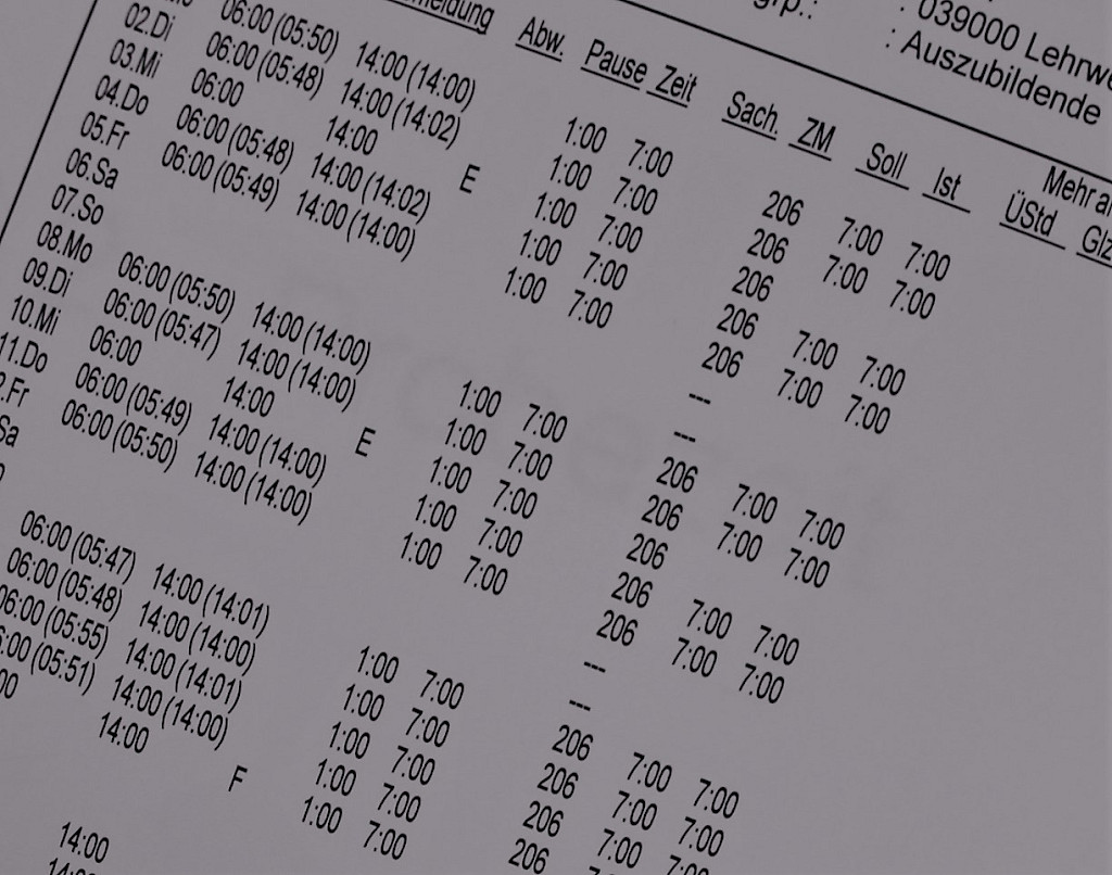Die tägliche Arbeitszeit während der Ausbildung beträgt 7 Stunden. Gearbeitet wird von 6:00 Uhr bis 14:00 Uhr. Während der Ausbildung hat man täglich 1 Stunde Pause in der Zeit von 9:00 Uhr bis 9:30 Uhr und von 12:30 Uhr bis 13:00 Uhr.